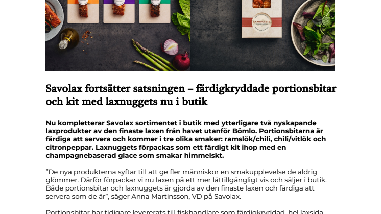 ”De nya produkterna syftar till att ge fler människor en smakupplevelse de aldrig glömmer. Därför förpackar vi nu laxen på ett mer lättillgängligt vis och säljer i butik. Både portionsbitar och laxnuggets är gjorda av den finaste laxen och färdiga att servera som de är”, säger Anna Martinsson, VD på Savolax.