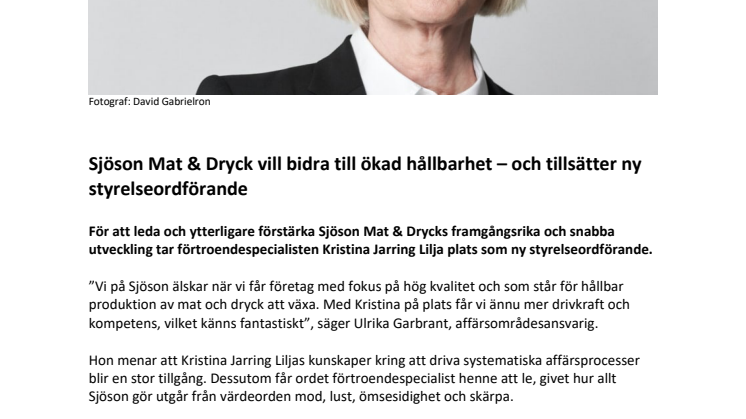 För att leda och ytterligare förstärka Sjöson Mat & Drycks framgångsrika och snabba utveckling tar förtroendespecialisten Kristina Jarring Lilja plats som ny styrelseordförande.