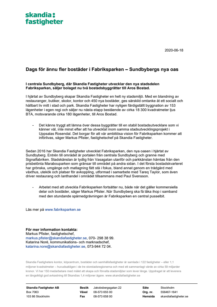I centrala Sundbyberg, där Skandia Fastigheter utvecklar den nya stadsdelen Fabriksparken, säljer bolaget nu två bostadsbyggrätter till Aros Bostad.