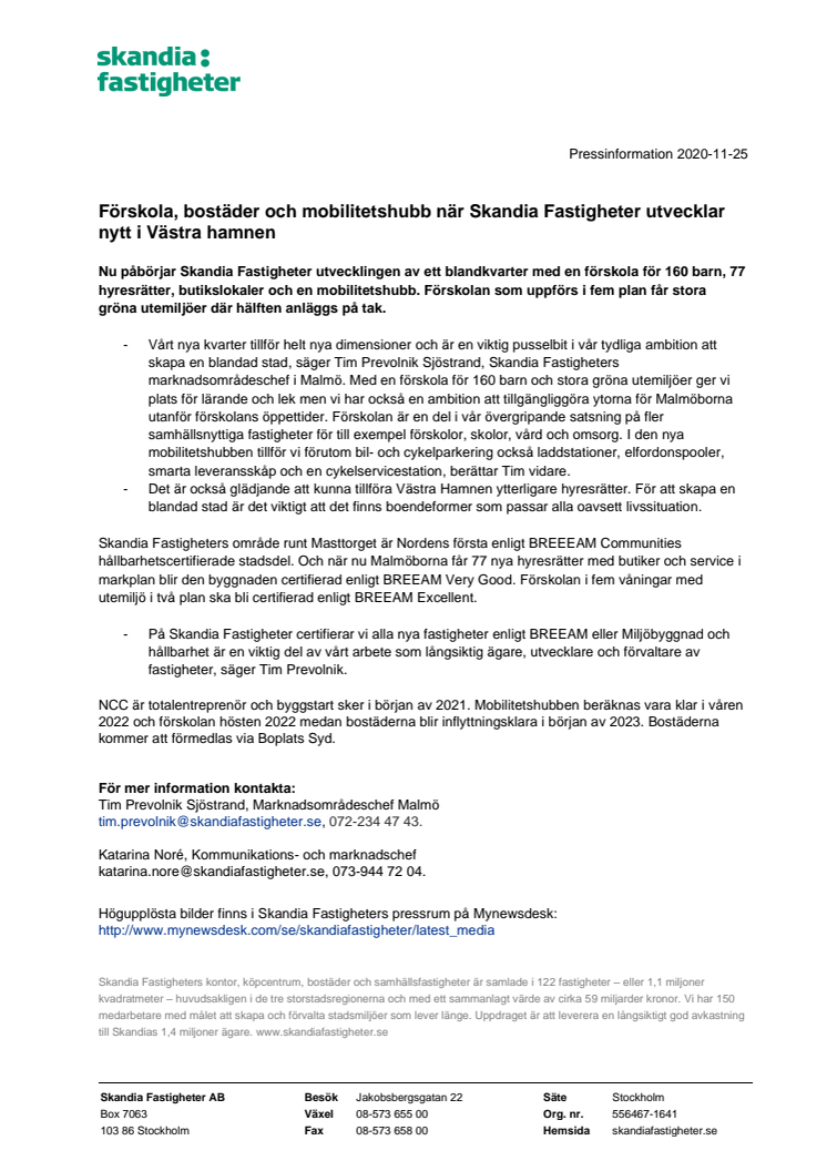 Förskola, bostäder och mobilitetshubb när Skandia Fastigheter utvecklar nytt i Västra hamnen