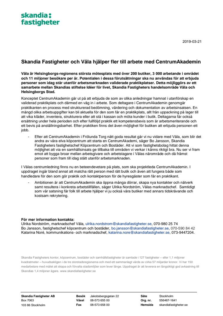 Skandia Fastigheter och Väla hjälper fler till arbete med CentrumAkademin