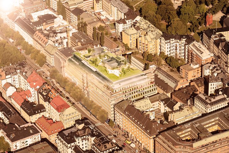 Skissbild över Diligentias kommande takpark på Sveavägen 44. Parken kommer att innehålla svenska djur- och naturarter såsom krattskog, torräng och klapperstensfält. Den hötorgsstora parken komplettera med insektshotell samt bikupor och kommer att stå klar 2014. Parken är ritad av landskapsarkitekt Johan Paju.