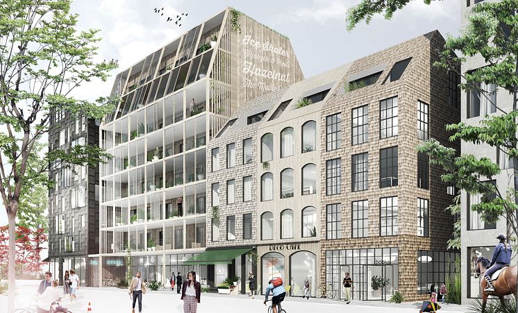 Visionsbild, fasadvy över Diligentias Woodhouse Rosendal, Uppsala