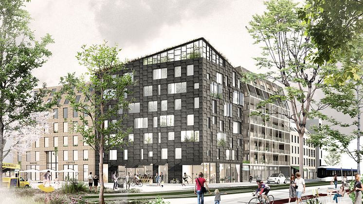 Visionsbild, gatuvy över Diligentias Woodhouse Rosendal, Uppsala