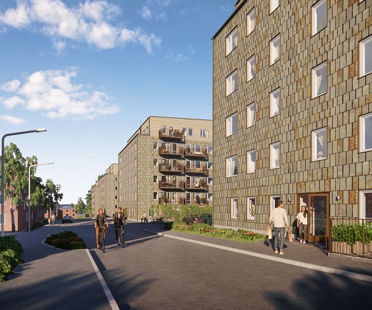 Visionsbild av Skandia Fastigheters punkthus i etapp 2 av utvecklingen av Kållered Centrum.