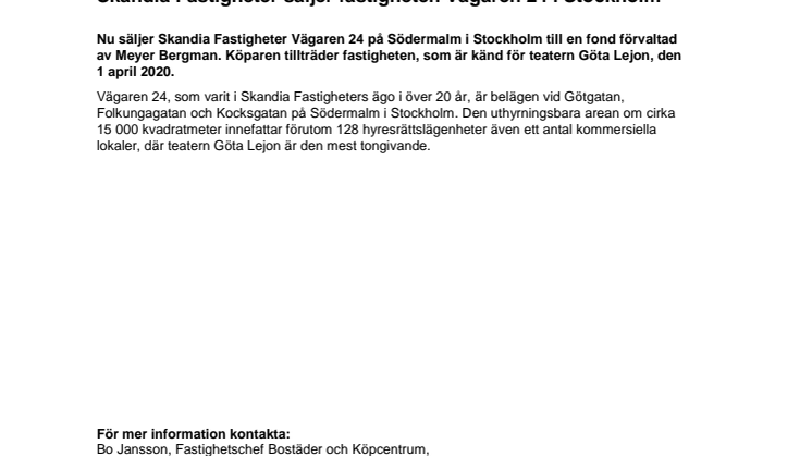 Nu säljer Skandia Fastigheter Vägaren 24 på Södermalm i Stockholm till en fond förvaltad av Meyer Bergman. Köparen tillträder fastigheten, som är känd för teatern Göta Lejon, den 1 april 2020.