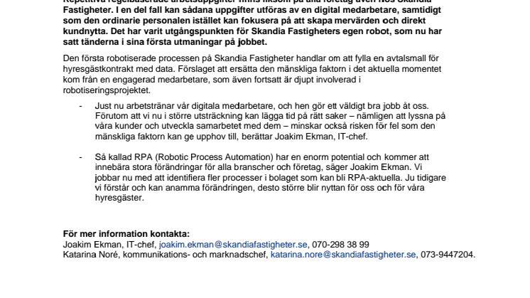 - Så kallad RPA (Robotic Process Automation) har en enorm potential och kommer att innebära stora förändringar för alla branscher och företag, säger Joakim Ekman. Vi jobbar nu med att identifiera fler processer i bolaget som kan bli RPA-aktuella. Ju tidigare vi förstår och kan anamma förändringen, desto större blir nyttan för oss och för våra hyresgäster.