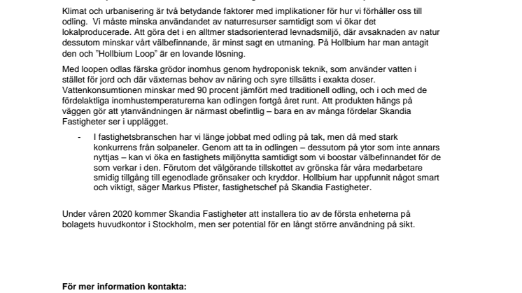 -I fastighetsbranschen har vi länge jobbat med odling på tak, men då med stark konkurrens från solpaneler. Genom att ta in odlingen – dessutom på ytor som inte annars nyttjas – kan vi öka en fastighets miljönytta samtidigt som vi boostar välbefinnandet för de som verkar i den. Förutom det välgörande tillskottet av grönska får våra medarbetare smidig tillgång till egenodlade grönsaker och kryddor. Hollbium har uppfunnit något smart och viktigt, säger Markus Pfister, fastighetschef på Skandia Fastigheter.