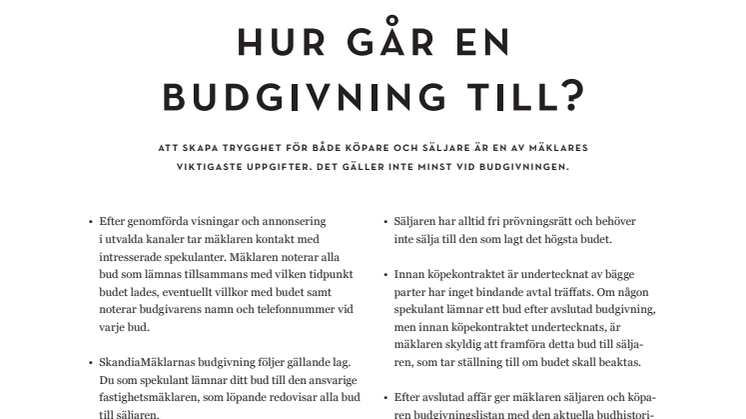- SkandiaMäklarnas budgivning följer gällande lag. Du som spekulant lämnar ditt bud till den ansvarige fastighetsmäklaren, som löpande redovisar alla bud till säljaren.