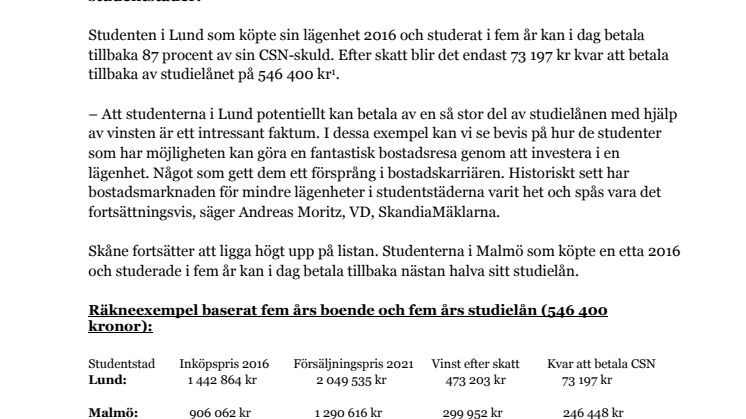 – Att studenterna i Lund potentiellt kan betala av en så stor del av studielånen med hjälp av vinsten är ett intressant faktum. I dessa exempel kan vi se bevis på hur de studenter som har möjligheten kan göra en fantastisk bostadsresa genom att investera i en lägenhet. Något som gett dem ett försprång i bostadskarriären. Historiskt sett har bostadsmarknaden för mindre lägenheter i studentstäderna varit het och spås vara det fortsättningsvis, säger Andreas Moritz, VD, SkandiaMäklarna.