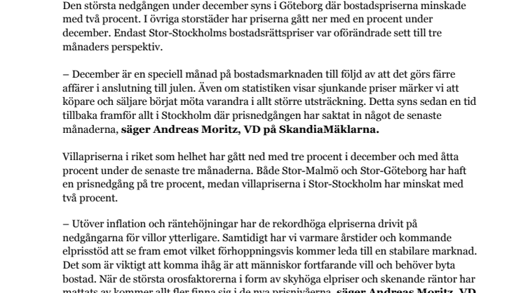 Den största nedgången under december syns i Göteborg där bostadspriserna minskade med två procent. I övriga storstäder har priserna gått ner med en procent under december. Endast Stor-Stockholms bostadsrättspriser var oförändrade sett till tre månaders perspektiv.