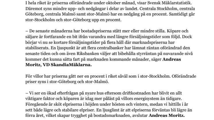 Under oktober månad syns inga större prisförändringar i Svensk Mäklarstatistik. I delar av landet backar priserna fortfarande någon enstaka procent, men för hela riket håller sig priserna oförändrade. Utbudet på marknaden är fortfarande stort, men det finns ljusglimtar, berättar SkandiaMäklarnas VD Andreas Moritz.