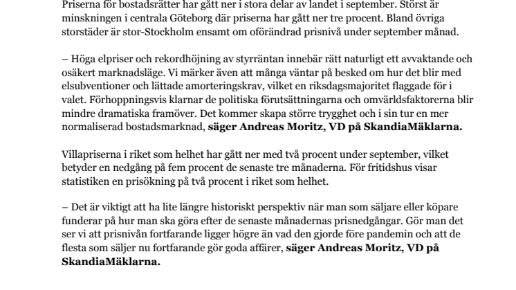 Septembersiffrorna från Svensk Mäklarstatistik visar fortsatta prisnedgångar över hela landet. Höga elpriser och ränteökningar har bromsat bostadsmarknaden rejält. Samtidigt finns förhoppningar om elpristak och lättnader av amorteringskrav vilket skulle skapa trygghet och ökad stabilitet på marknaden, menar SkandiaMäklarnas vd Andreas Moritz.