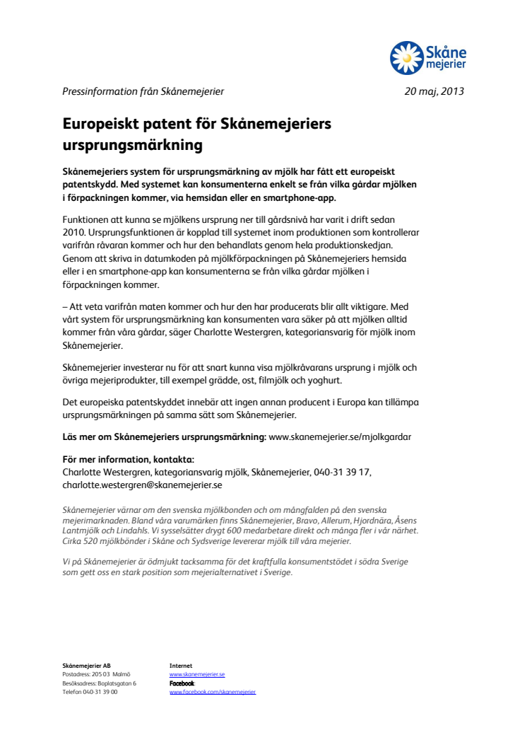 Skånemejeriers system för ursprungsmärkning av mjölk har fått ett europeiskt patentskydd. Med systemet kan konsumenterna enkelt se från vilka gårdar mjölken i förpackningen kommer, via hemsidan eller en smartphone-app.