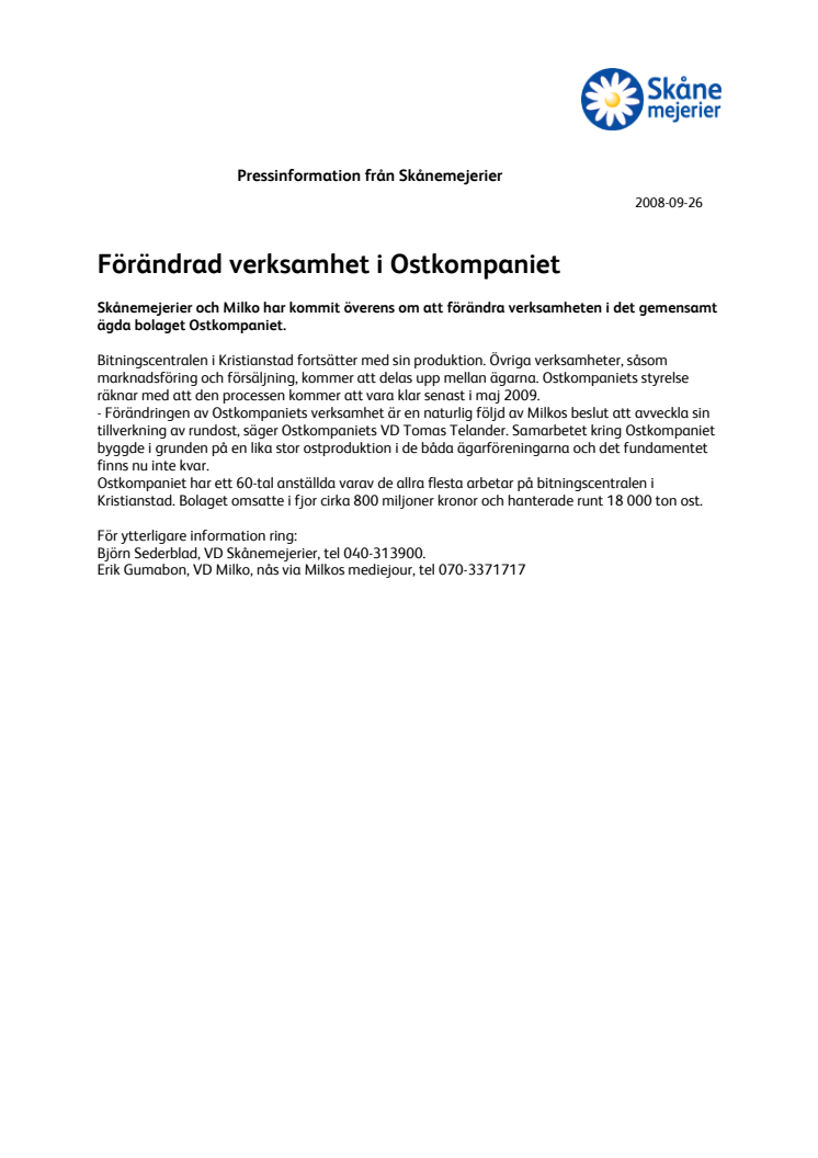 Skånemejerier och Milko har kommit överens om att förändra verksamheten i det gemensamt ägda bolaget Ostkompaniet.