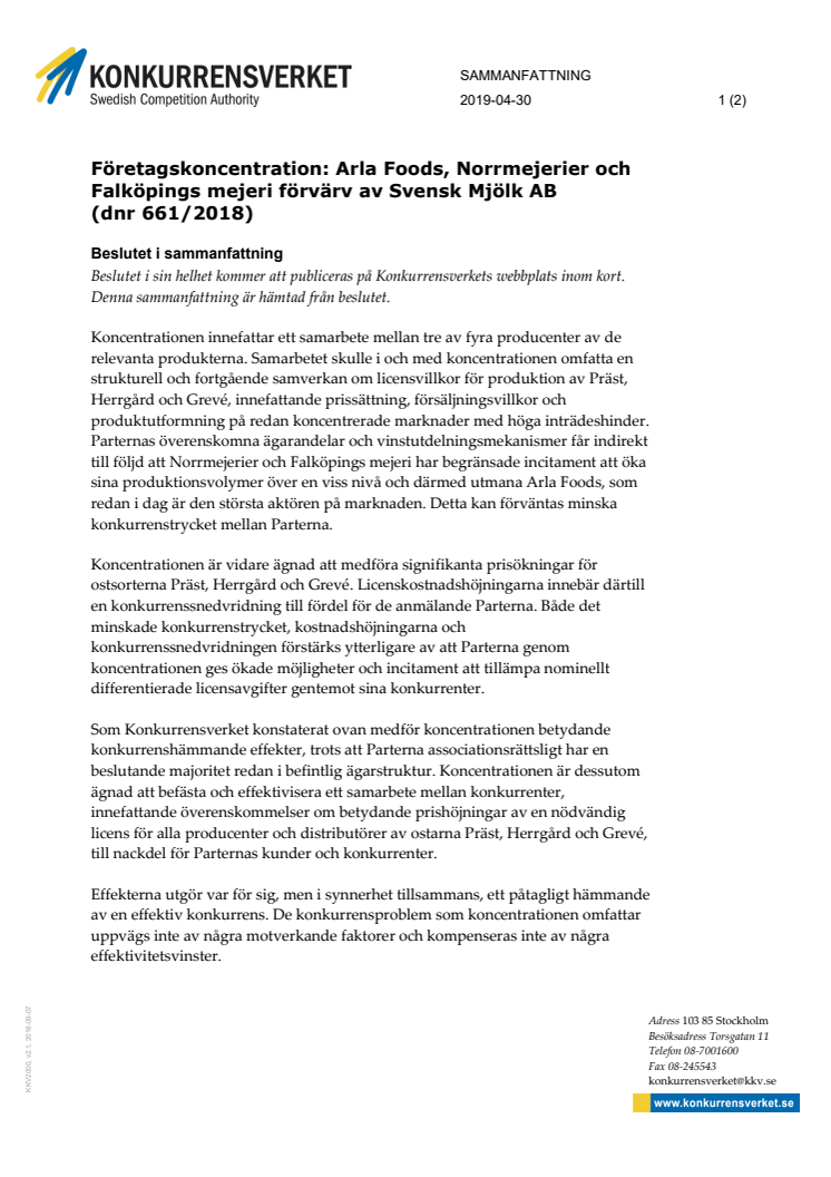 Konkurrensverkets beslut koncentration varumärken ost - Sammanfattning