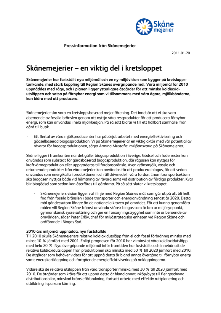 Skånemejerier har fastställt nya miljömål och en ny miljövision som bygger på kretsloppstänkande, med stark koppling till Region Skånes övergripande mål. Våra miljömål för 2010 uppnåddes med råge, och i planen ligger ytterligare åtgärder för att minska koldioxidutsläppen och satsa på förnybar energi som vi tillsammans med våra ägare, mjölkbönderna, kan bidra med att producera.