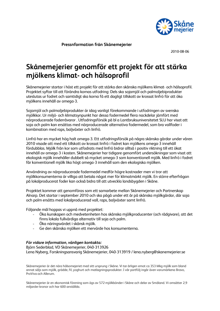 Skånemejerier startar i höst ett projekt för att stärka den skånska mjölkens klimat- och hälsoprofil. Projektet syftar till att förändra kornas utfodring: Dels ska sojamjöl och palmoljebiprodukter uteslutas ur fodret och samtidigt ska korna få ett dagligt tillskott av krossat linfrö för att öka mjölkens innehåll av omega-3.