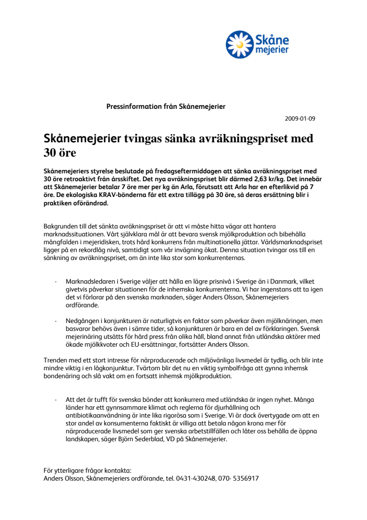 Skånemejeriers styrelse beslutade på fredagseftermiddagen att sänka avräkningspriset med 30 öre retroaktivt från årsskiftet. Det nya avräkningspriset blir därmed 2,63 kr/kg. Det innebär att Skånemejerier betalar 7 öre mer per kg än Arla, förutsatt att Arla har en efterlikvid på 7 öre. De ekologiska KRAV-bönderna får ett extra tillägg på 30 öre, så deras ersättning blir i praktiken oförändrad.