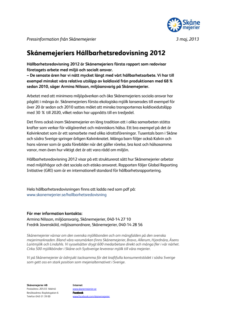 Hållbarhetsredovisning 2012 är Skånemejeriers första rapport som redovisar företagets arbete med miljö och socialt ansvar.