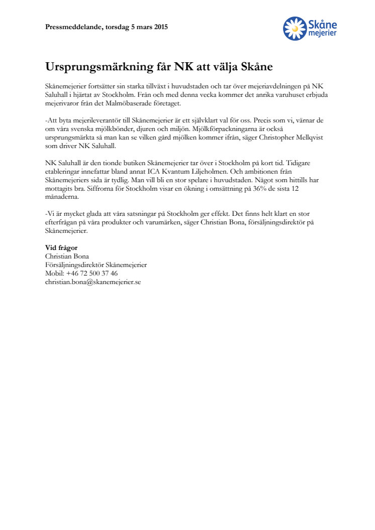 NK byter leverantör och väljer ursprungsmärkt mjölk från Skånemejerier. NK Saluhall är den tionde butiken Skånemejerier tar över i Stockholm på kort tid. Siffrorna för Stockholm visar en ökning i omsättning på 36% de sista 12 månaderna.