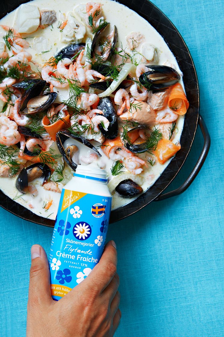 Som vanlig crème fraiche – fast enklare. Skruva bara av korken och häll lagom mängd i grytan. Den blandar sig snabbare. Och har självklart samma goda, syrliga smak. Flaskan gör hanteringen snabb och förvaringen enkel – tills nästa gång.