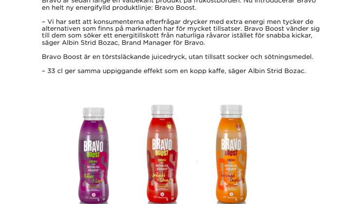 – Vi har sett att konsumenterna efterfrågar drycker med extra energi men tycker de alternativen som finns på marknaden har för mycket tillsatser. Bravo Boost vänder sig till dem som söker ett energitillskott från naturliga råvaror istället för snabba kickar, säger Albin Strid Bozac, Brand Manager för Bravo.