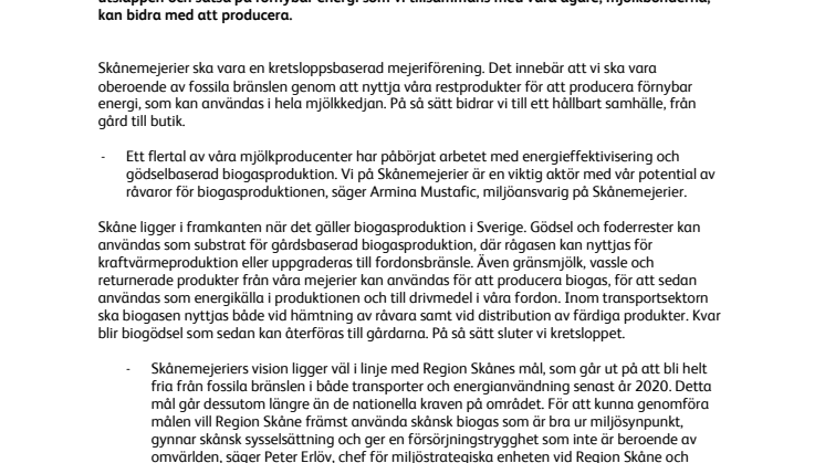 Skåne ligger i framkanten när det gäller biogasproduktion i Sverige. Gödsel och foderrester kan användas som substrat för gårdsbaserad biogasproduktion, där rågasen kan nyttjas för kraftvärmeproduktion eller uppgraderas till fordonsbränsle. Även gränsmjölk, vassle och returnerade produkter från våra mejerier kan användas för att producera biogas, för att sedan användas som energikälla i produktionen och till drivmedel i våra fordon. Inom transportsektorn ska biogasen nyttjas både vid hämtning av råvara samt vid distribution av färdiga produkter. Kvar blir biogödsel som sedan kan återföras till gårdarna. På så sätt sluter vi kretsloppet.