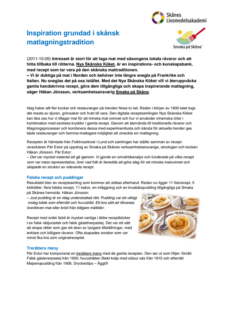 Intresset är stort för att laga mat med säsongens lokala råvaror och att hitta tillbaka till rötterna. Nya Skånska Köket, är en inspirations- och kunskapsbank, med recept som tar vara på den skånska mattraditionen.