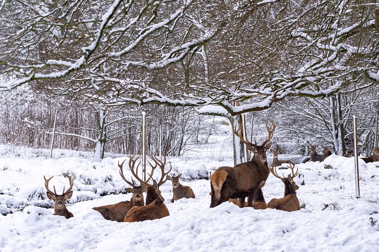 Kronhjortar i snön på Skånes Djurpark