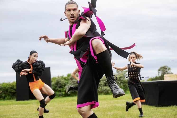 Domino i koreografi av Erika Silgoner. Premiär i Daniaparken, Malmö 1 juni 2024. Turné i Skåne och Stockholm. I bild: Jing Yi Wang, Fabrizio Di Franco, Hanna Nussbaumer.
