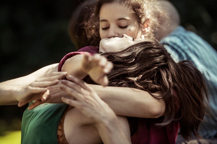 Posterfoto Don't, Kiss .Skånes. Koreografi Fabio Liberti. Premiär i Drottninghögsparken, Helsingborg 18 juni, 2022. Sedan turnerar verket i Skåne och Köpenhamn. I bild: Maria Pilar Abaurrea Zardoya och Marion Rastouil.