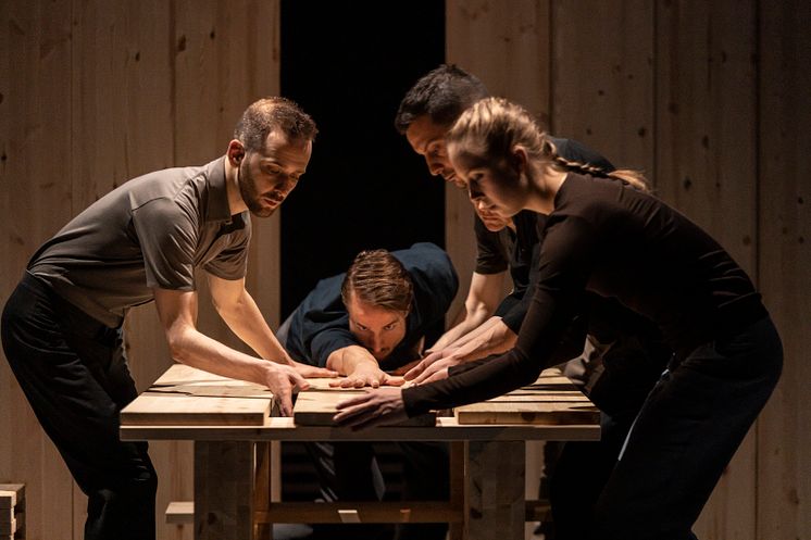 TRIP. En tredelad kväll som vrider på perspektiven: Featherweight av Roser López Espinosa, The longest distance between two points av Fernando Melo och Snapshots of a Crowd av Lidia Wos. Spelas på Skånes Dansteater 15 maj-1 juni 2019. Bild ur: The longest distance between two points. I bild: Samuel Denton, Tiemen Stemerding, Riccardo Zandoná, Laura Lohi, Cassandra Arnmark.