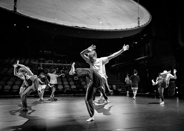 Bild från repetitionerna av Transit, Skånes Dansteaters föreställning som har världspremiär på Malmö Opera 3 okt 2020. Spelas fram till 1 nov 2020. Koreografi Tero Saarinen. I bild: Emma Välimäki, Dario Minoia, Riccardo Zandoná, Tiemen Stemerding, Samuel Denton.