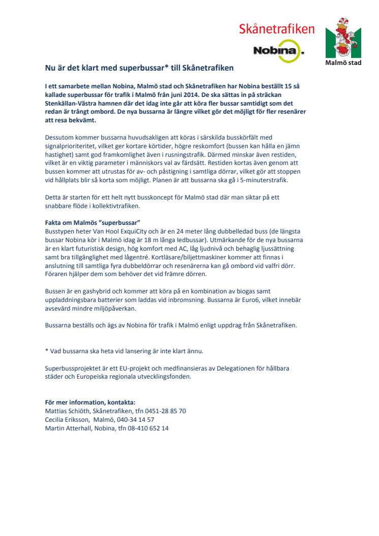 I ett samarbete mellan Nobina, Malmö stad och Skånetrafiken har Nobina beställt 15 så kallade superbussar för trafik i Malmö från juni 2014. De ska sättas in på sträckan Stenkällan-Västra hamnen där det idag inte går att köra fler bussar samtidigt som det redan är trångt ombord. De nya bussarna är längre vilket gör det möjligt för fler resenärer att resa bekvämt.