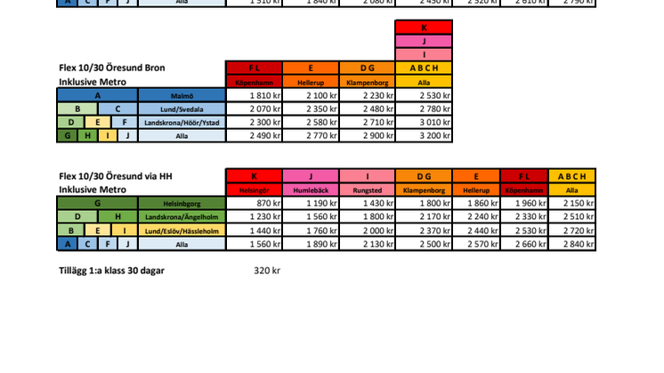 - Hela Skåne-Köpenhamn 2440 kronor (30-dagarsbiljett 3245 kr, 24-timmarsbiljett 430 kr).