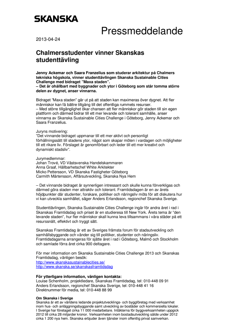 Chalmersstudenter vinner Skanskas studenttävling i Göteborg