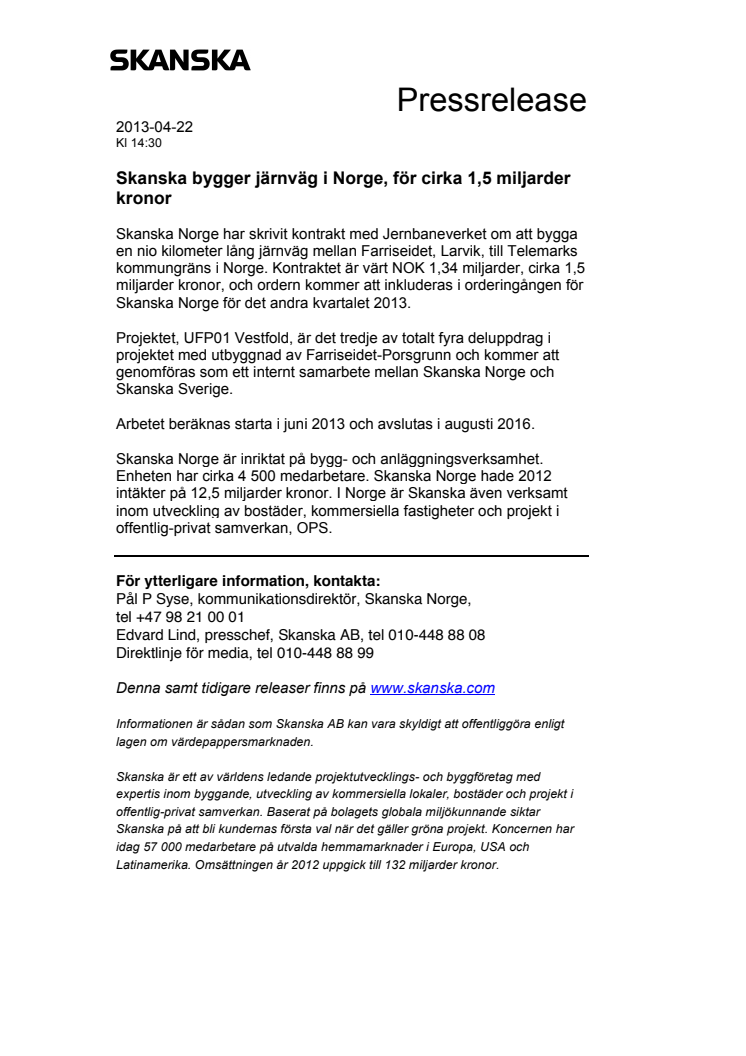 Skanska Norge har skrivit kontrakt med Jernbaneverket om att bygga en nio kilometer lång järnväg mellan Farriseidet, Larvik, till Telemarks kommungräns i Norge. Kontraktet är värt NOK 1,34 miljarder, cirka 1,5 miljarder kronor, och ordern kommer att inkluderas i orderingången för Skanska Norge för det andra kvartalet 2013.