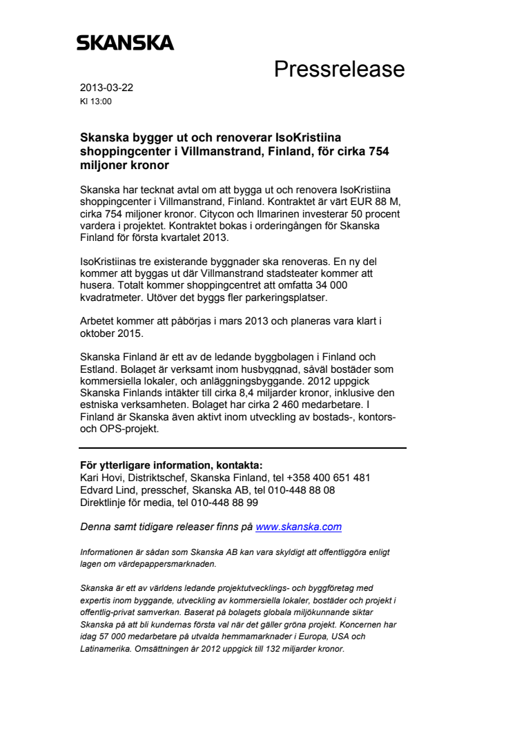 Skanska har tecknat avtal om att bygga ut och renovera IsoKristiina shoppingcenter i Villmanstrand, Finland. Kontraktet är värt EUR 88 M, cirka 754 miljoner kronor. Citycon och Ilmarinen investerar 50 procent vardera i projektet. Kontraktet bokas i orderingången för Skanska Finland för första kvartalet 2013.