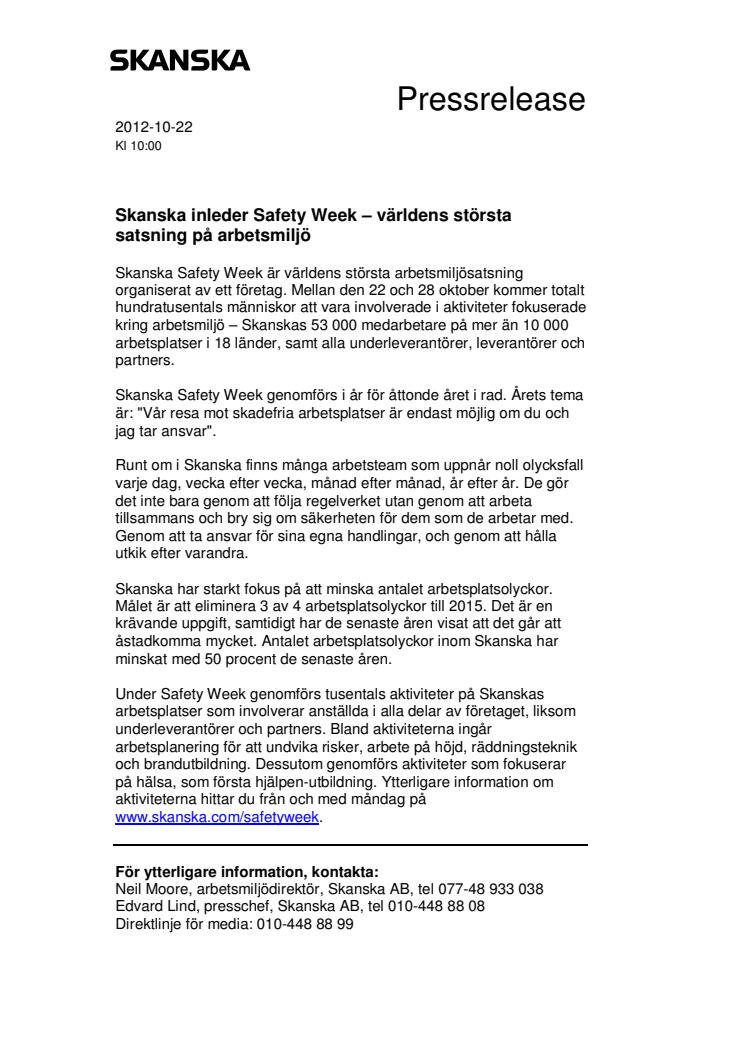 Skanska Safety Week är världens största arbetsmiljösatsning organiserat av ett företag. Mellan den 22 och 28 oktober kommer totalt hundratusentals människor att vara involverade i aktiviteter fokuserade kring arbetsmiljö – Skanskas 53 000 medarbetare på mer än 10 000 arbetsplatser i 18 länder, samt alla underleverantörer, leverantörer och partners.