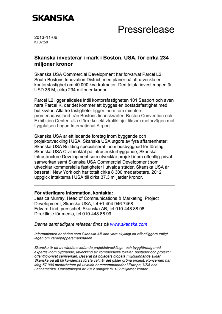 Skanska USA Commercial Development har förvärvat Parcel L2 i South Bostons Innovation District, med planer på att utveckla en kontorsfastighet om 40 000 kvadratmeter. Den totala investeringen är USD 36 M, cirka 234 miljoner kronor.