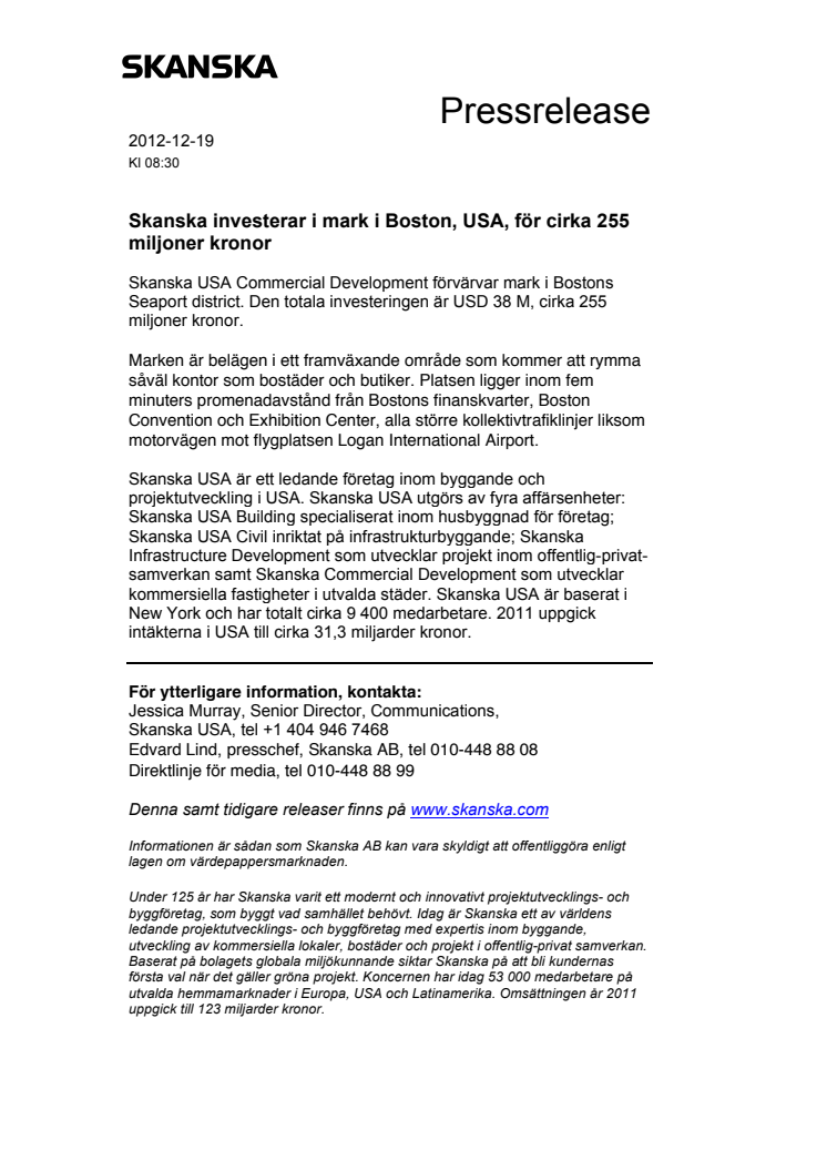 Skanska USA Commercial Development förvärvar mark i Bostons Seaport district. Den totala investeringen är USD 38 M, cirka 255 miljoner kronor.