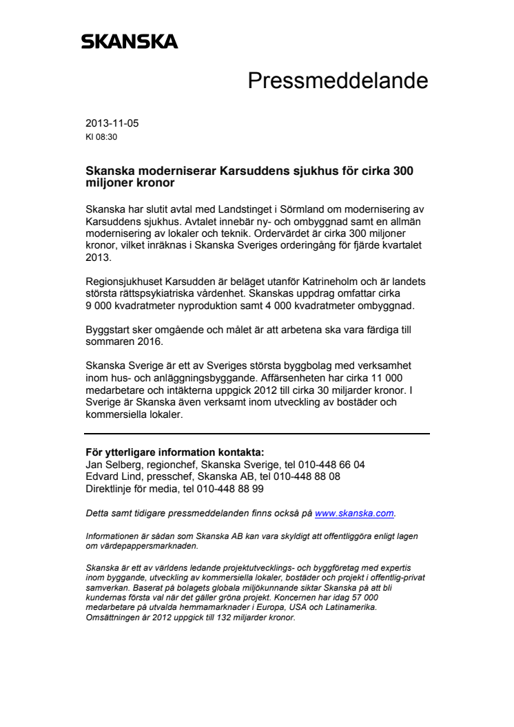 Skanska har slutit avtal med Landstinget i Sörmland om modernisering av Karsuddens sjukhus. Avtalet innebär ny- och ombyggnad samt en allmän modernisering av lokaler och teknik. Ordervärdet är cirka 300 miljoner kronor, vilket inräknas i Skanska Sveriges orderingång för fjärde kvartalet 2013.
