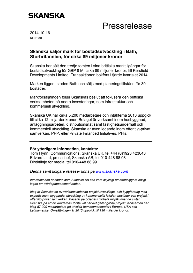 Skanska har sålt den tredje tomten i sina brittiska marktillgångar för bostadsutveckling för GBP 8 M, cirka 89 miljoner kronor, till Kersfield Developments Limited. Transaktionen bokförs i fjärde kvartalet 2014.