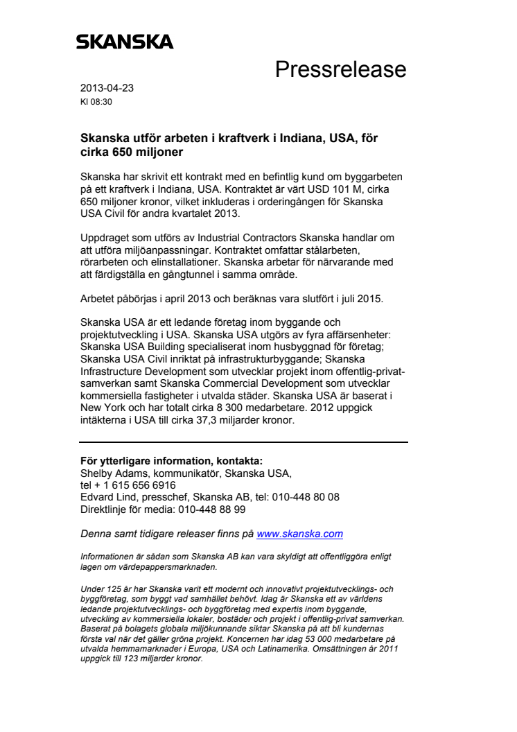 Skanska har skrivit ett kontrakt med en befintlig kund om byggarbeten på ett kraftverk i Indiana, USA. Kontraktet är värt USD 101 M, cirka 650 miljoner kronor, vilket inkluderas i orderingången för Skanska USA Civil för andra kvartalet 2013.