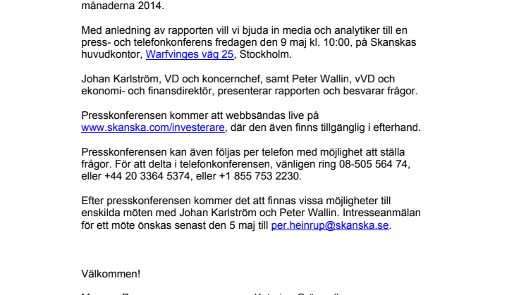 Fredagen den 9 maj rapporterar Skanska resultatet för de första tre månaderna 2014. Med anledning av rapporten vill vi bjuda in media och analytiker till en press- och telefonkonferens fredagen den 9 maj kl. 10:00, på Skanskas huvudkontor,Warfvinges väg 25 , Stockholm.