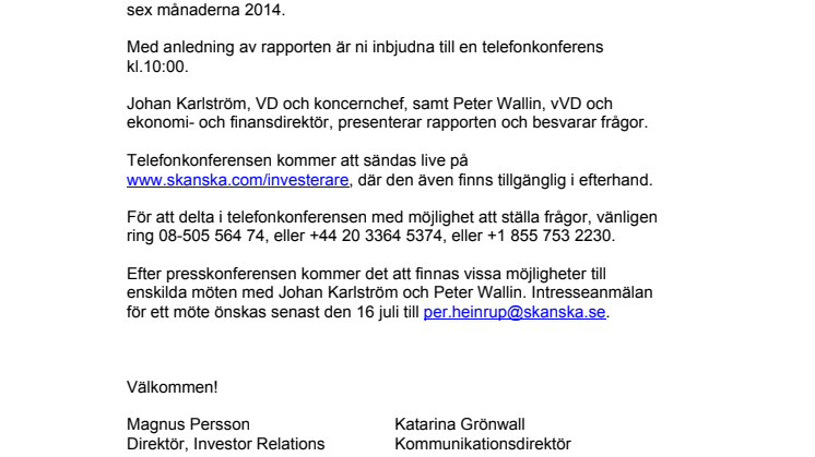 Efter presskonferensen kommer det att finnas vissa möjligheter till enskilda möten med Johan Karlström och Peter Wallin. Intresseanmälan för ett möte önskas senast den 16 juli till per.heinrup@skanska.se .