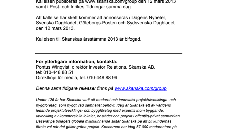 I enlighet med NASDAQ OMX Stockholms ABs Regelverk för emittenter meddelar Skanska AB genom detta pressmeddelande innehållet i kallelsen till årsstämman den 11 april 2013.
