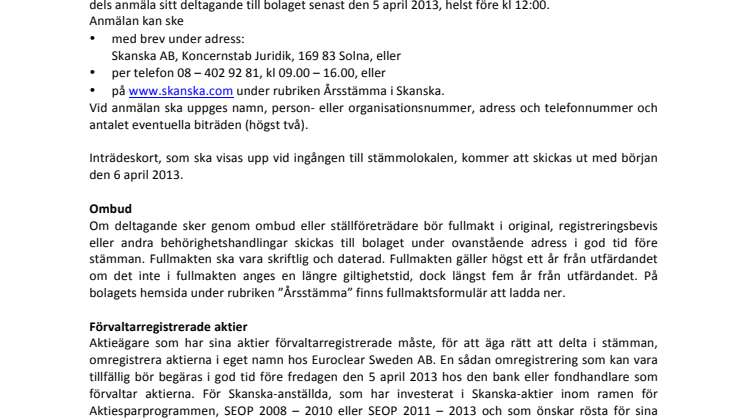 Kallelsen publiceras på www.skanska.com/group den 12 mars 2013 samt i Post- och Inrikes Tidningar samma dag.