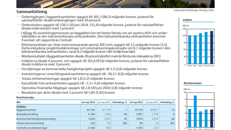 - Rörelseresultatet var i linje med motsvarande period 2013 och uppgick till 3,5 miljarder kronor (3,5). Detta inkluderar projektnedskrivningar och omstruktureringskostnader om 0,7 miljarder kronor i den latinamerikanska verksamheten, varav 0,2 miljarder kronor i det tredje kvartalet.